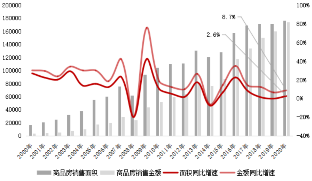 2020年全國商品房銷售面積、金額在疫后體量逐月快速回升,增速則經歷了先升后降的總體趨勢。國家統計局數據顯示:全年商品房銷售面積、金額達176086萬平方米和173613億元,累計同比上漲2.6%和8.7%。