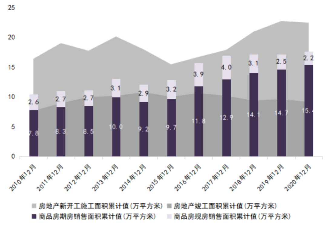 2020年房企房屋新開工面積在“三條紅線”出臺后便相應止升回落。下半年新房市場銷售表現不及預期使得房企對未來預期看淡。同時融資收緊下房企資金問題短期內難以發生根本轉變,房企對開工進度與施工強度的抉擇將受到持續影響。由于2020年房企土地購置面積依舊呈負增長,因此預計2021年可待開發土地規模有限,將拖累新開工指標,2021年新開工面積規模將繼續低位,但相比于2020年同比有望正增長,主要由于2020年規模較低且負增長,前值較低。