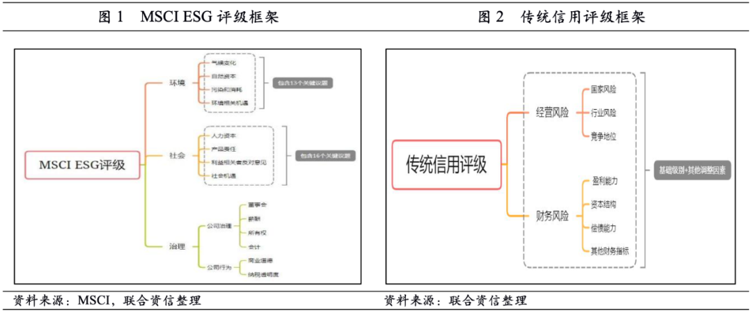 ESG是環(huán)境(Environmental)、社會(Social)和治理(Governance)的英文簡稱,而ESG評級即是針對企業(yè)在環(huán)境、社會和公司治理三個方面進行評分考核,從長遠角度判斷企業(yè)是否具備可持續(xù)發(fā)展的價值。ESG評級主要由市場中專注于提供ESG評級的第三方企業(yè)披露,比如MSCI等機構。企業(yè)信用評級簡單來說就是對企業(yè)信用風險的評估,考察發(fā)債企業(yè)的償債能力和償債意愿,主要由傳統(tǒng)信用評級機構披露。從概念上來看,ESG評級和信用評級評估的側重方向不同。我們選取了MSCI公開披露的ESG評級方法和傳統(tǒng)信用評級方法作為對比,以觀察兩種評級體系在評級方法、技術模型和指標選取等方面存在的本質上的區(qū)別。