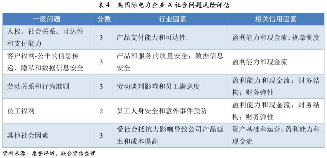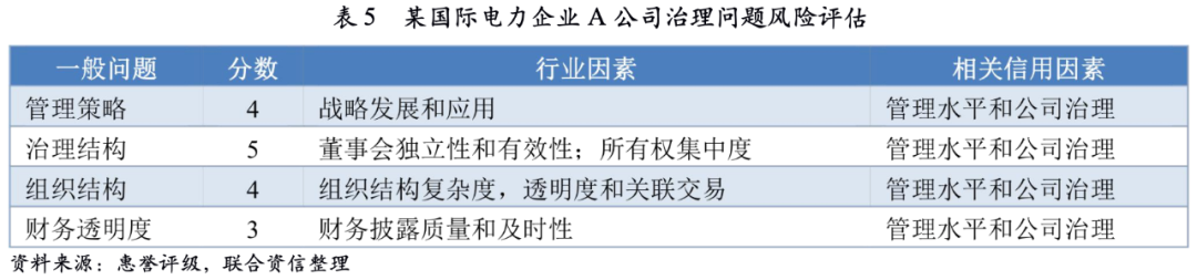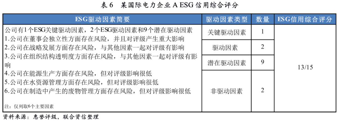 惠譽評級結合環(huán)境、社會和公司治理三大方面對某國際電力企業(yè)A進行風險評估,綜合匯總了ESG對企業(yè)A信用評級驅動因素并通過各個驅動因素數(shù)量得出ESG信用綜合評分。該ESG信用綜合評分表明ESG風險對企業(yè)A信用水平有很大影響,其中公司治理問題和信用評級關聯(lián)度最大,未來需重點關注。
