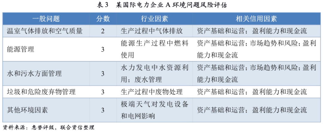 以某國際電力企業(yè)A為例,該電力企業(yè)涉及環(huán)境(E)方面一般問題有五個,分別為溫室氣體排放和空氣質量、能源管理、水和污水方面管理、垃圾和危險廢棄物管理以及其他環(huán)境因素。在該公司所處的特定行業(yè)下,公司涉及環(huán)境方面因素相關度評分主要集中于分數(shù)3(如表3所示),即環(huán)境方面的問題與該公司信用評級相關度低,對企業(yè)信用評級的影響很小。比如對水和污水管理方面評分,主要考慮了公司在水力發(fā)電中水資源利用和廢水管理,該因素是公司ESG潛在評級因素,可能對公司資產基礎運營、盈利能力和現(xiàn)金流等相關信用因素產生一定影響。