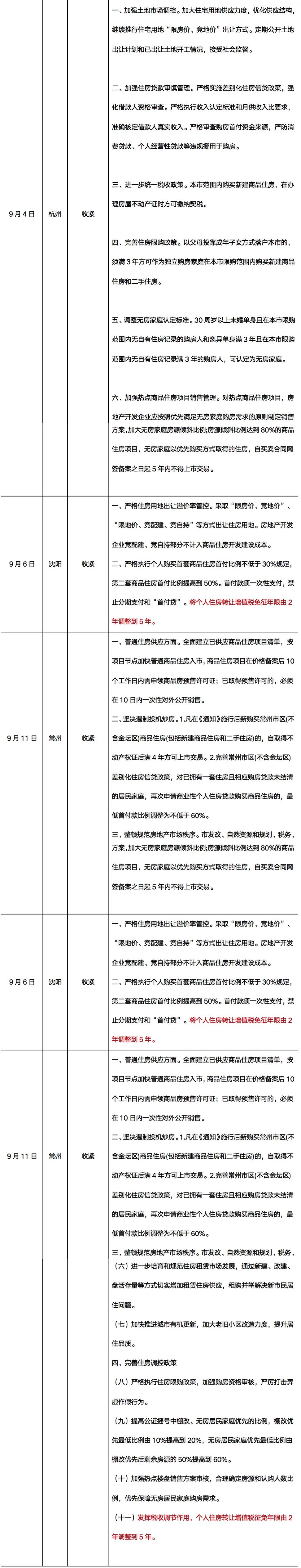 9月14日,參加中央房地產(chǎn)工作座談會的最后一個熱點二線城市成都出臺“房產(chǎn)新政15條”,此外,9月12日,常州也出臺新政,市區(qū)限售4年;二套房貸最低首付提高至60%。截至目前,已經(jīng)超11城發(fā)布或緊或松新政13條,其中,杭州兩個月來連發(fā)多條政策為樓市調(diào)控“打補丁”。