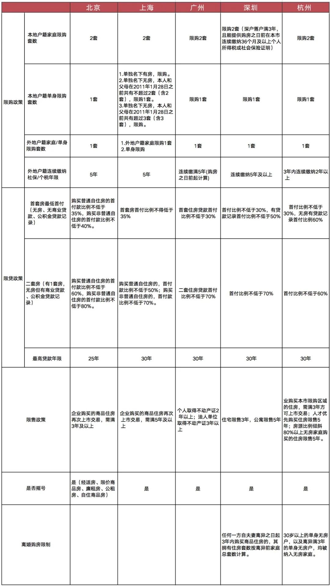 從限貸政策來看,北京和上海均對無房、無商業(yè)貸款、公積金貸款記錄的首套房設(shè)置最低首付比例為35%,廣州和深圳與其他熱點二線城市一樣,均為30%,
