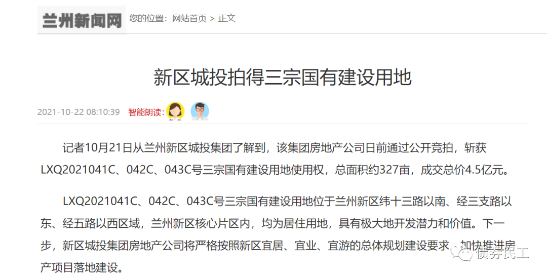 2021年10月22日,蘭州新區城市發展投資集團有限公司的下屬子公司蘭州新區房地產開發有限公司以4.5億元的價格摘得蘭州新區總出讓面積為327畝的土地,土地性質為住宅用地。