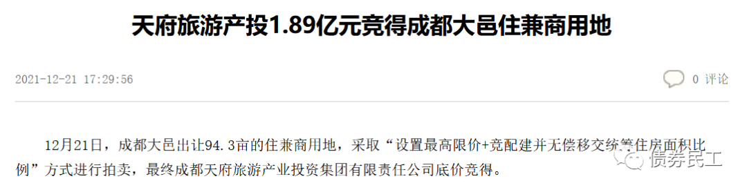 2021年12月21日,成都文化旅游發展集團有限責任公司的子公司成都天府旅游產業投資集團有限責任公司以1.89億元的價格摘得成都大邑縣總出讓面積為94.3畝的土地,土地性質為住兼商用地。