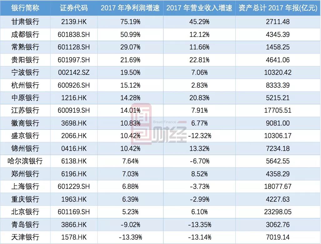 與同行業相比,鄭州銀行2017年的利潤增速處于中等偏下水平。18家A股和H股上市的城商行2017年利潤增速如下表: