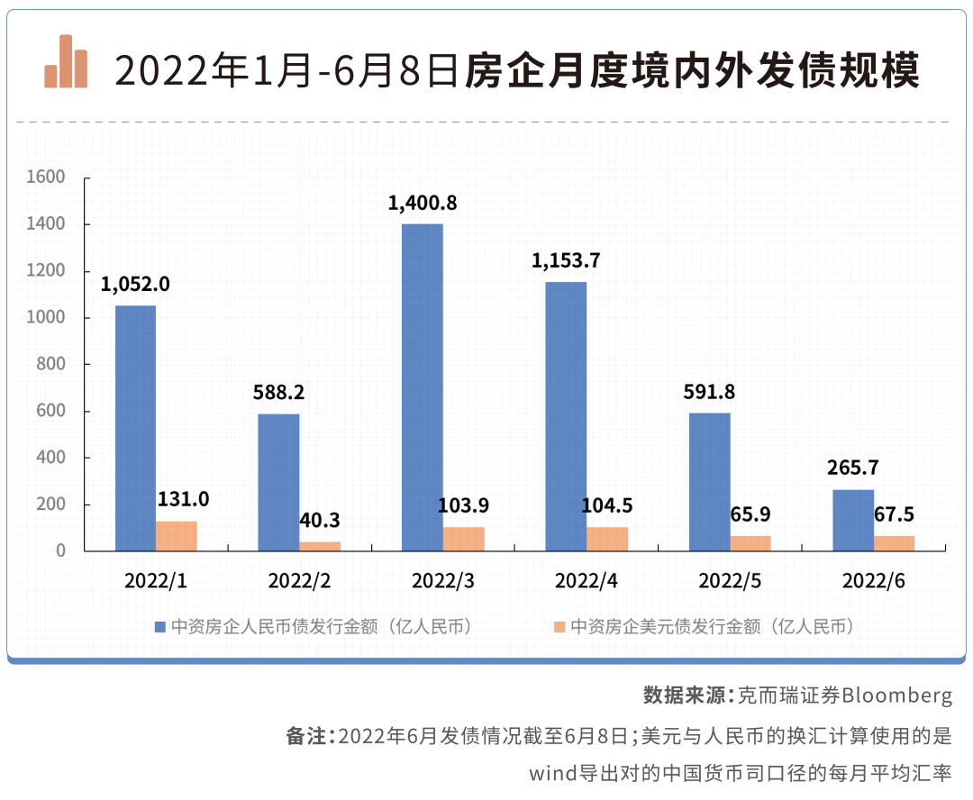 2022年以來,房企美元債幾乎處于“冰封”狀態,截止6月8日,中資房企美元債累計發行金額為513億元,其中5月份更是年內低點,中資房企美元債共發行65.9億元,同比減少79%。