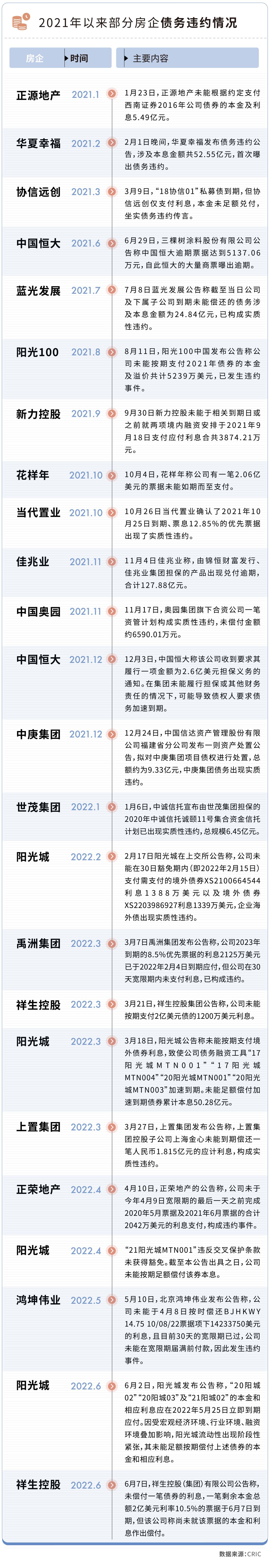 據不完全統計,自2022年以來至今不足半年已有至少9家上市房企宣告實質性違約,至少3家房企實施債務重組,面對即將到期的債券,11家房企尋求債務展期。