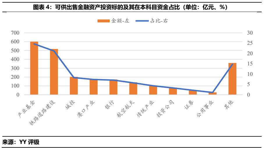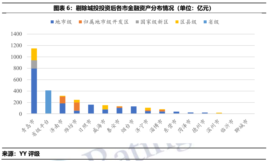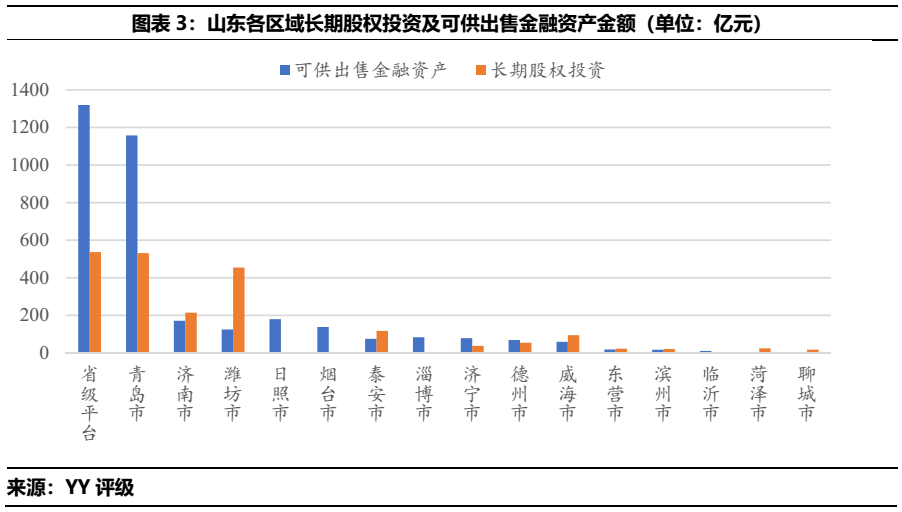 為探究山東城投產(chǎn)業(yè)化的方向,本文選取截至2020年末山東城投中可供金融資產(chǎn)或長(zhǎng)期股權(quán)投資科目大于10億的企業(yè),就上述兩科目進(jìn)行拆分,觀察各區(qū)域城投的產(chǎn)業(yè)投向。