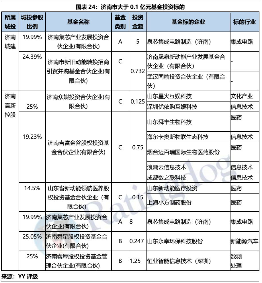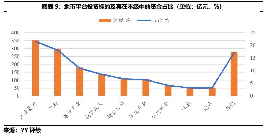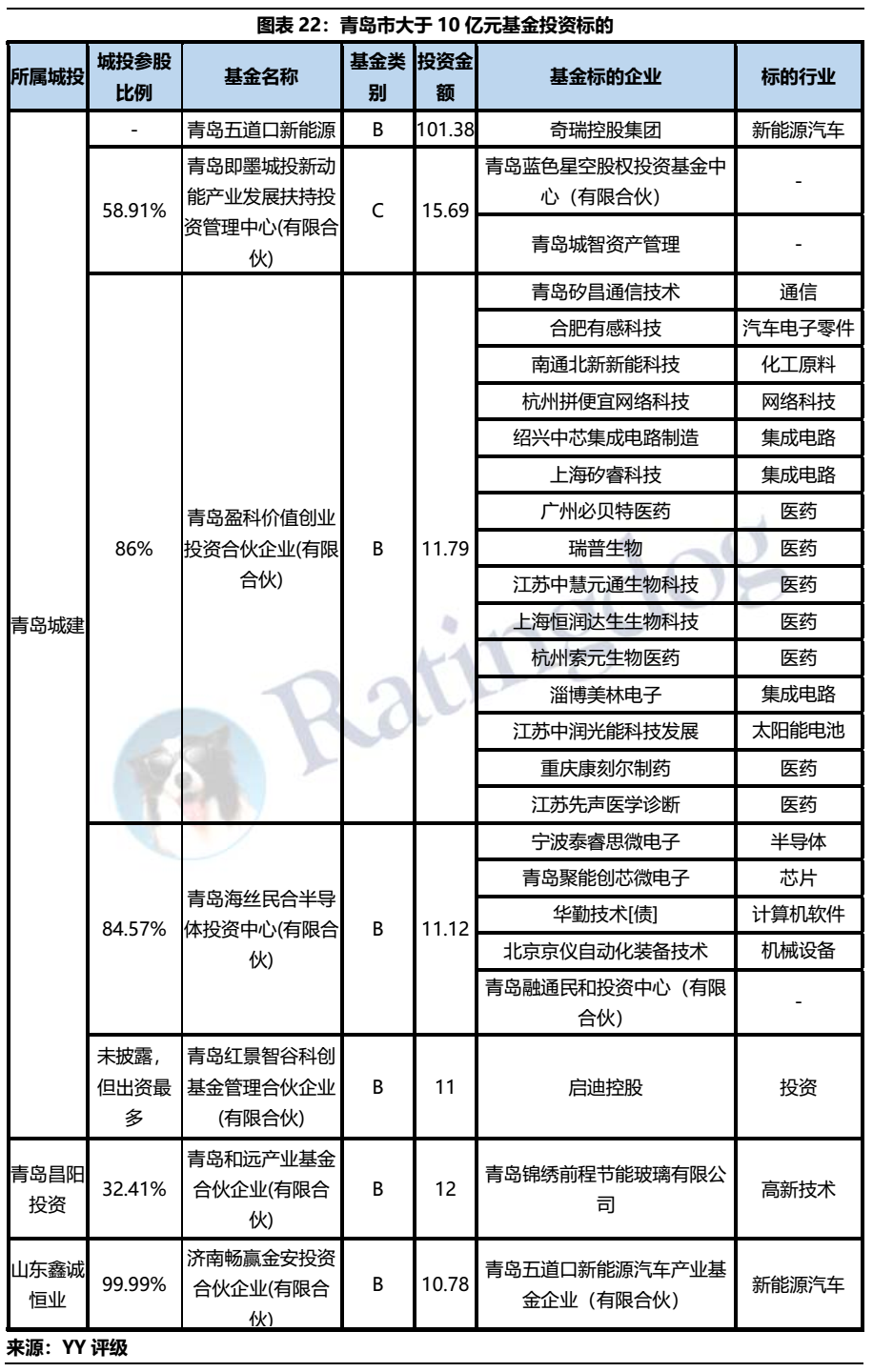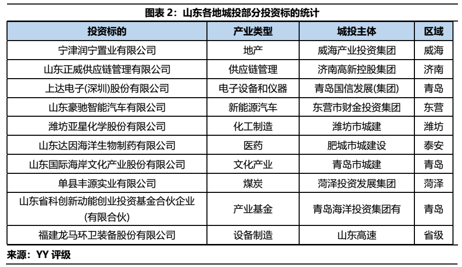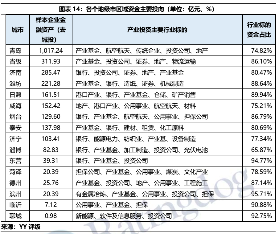 綜合來(lái)說,除去城投類投資,山東城投產(chǎn)業(yè)化的方向多為產(chǎn)業(yè)基金(主要投資標(biāo)的為信息技術(shù)、汽車和醫(yī)藥行業(yè))、銀行(約88.10%投向本土銀行)、地產(chǎn)、投資公司、港口產(chǎn)業(yè)、航空航天。