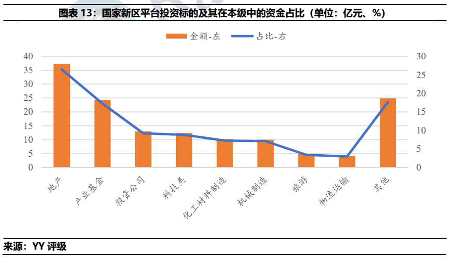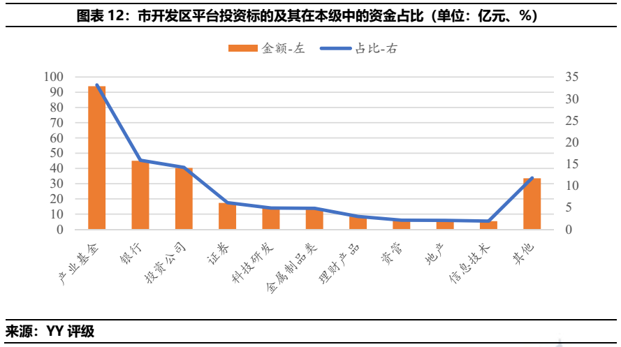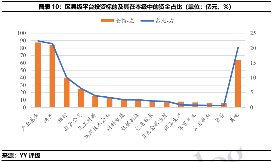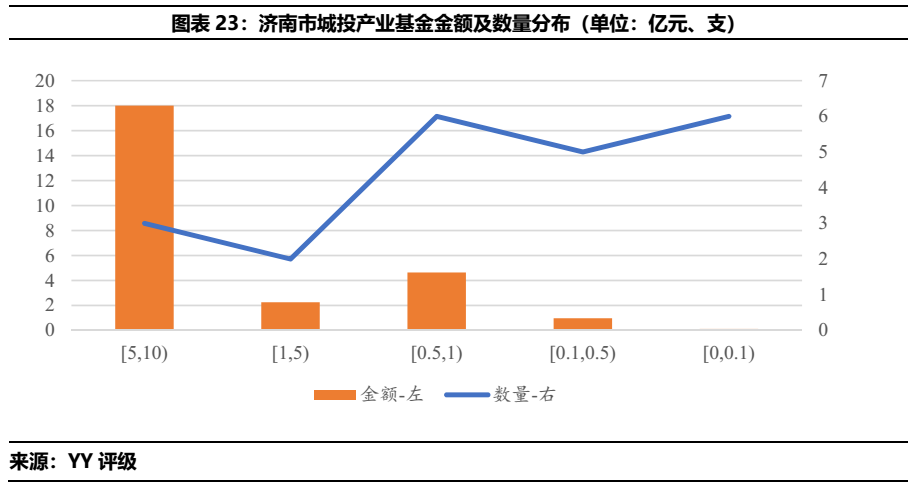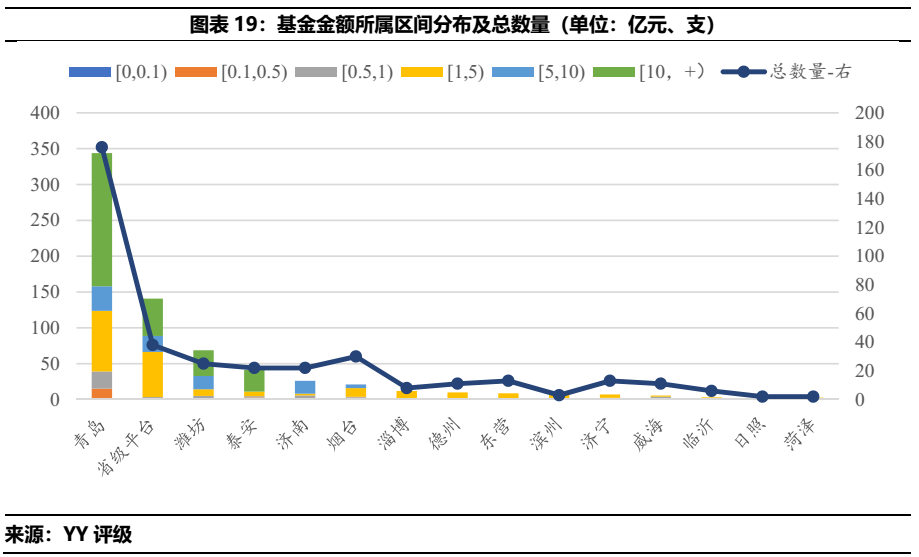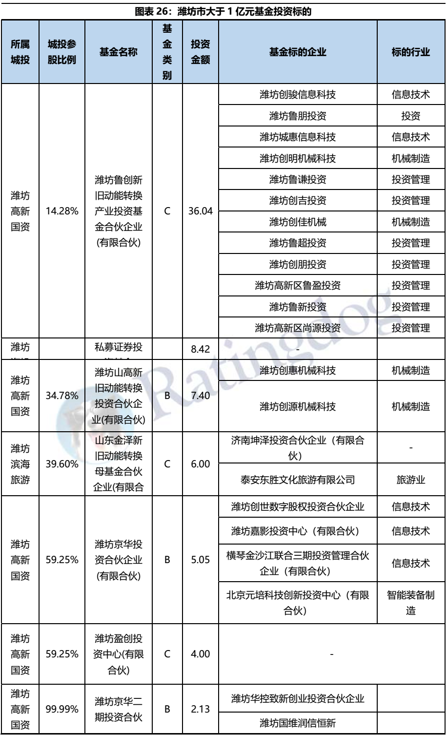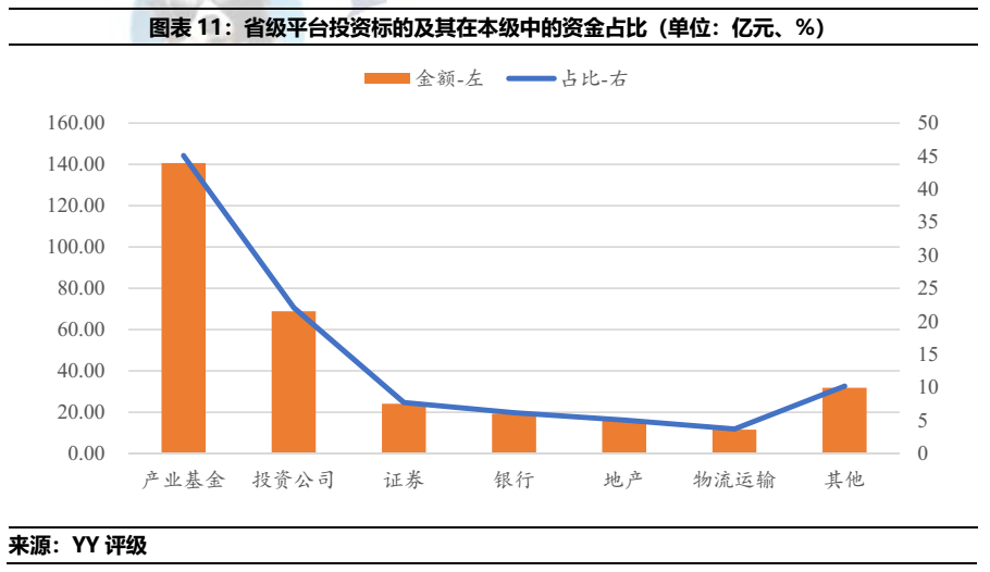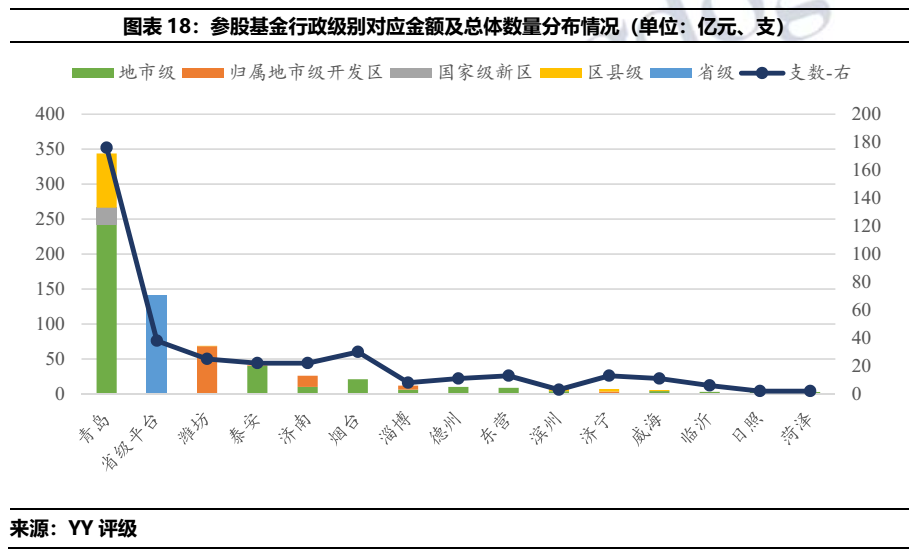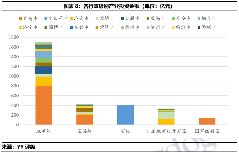 總體來(lái)看,山東城投偏好于產(chǎn)業(yè)基金、銀行、投資類公司的投資,上述標(biāo)的投資分別占去城投類投資總額的25.52%、13.29%和9.33%。分行政區(qū)域劃分來(lái)看,僅有國(guó)家級(jí)開發(fā)區(qū)投資最多為地產(chǎn)行業(yè),其余皆為產(chǎn)業(yè)基金。分地市級(jí)來(lái)看,產(chǎn)業(yè)基金投資占比第一的區(qū)域分別為青島、省級(jí)平臺(tái)、濰坊、泰安和德州。銀行投資在投資金額中占比最高的區(qū)域則是濟(jì)南、煙臺(tái)、濟(jì)寧、淄博和東營(yíng)。