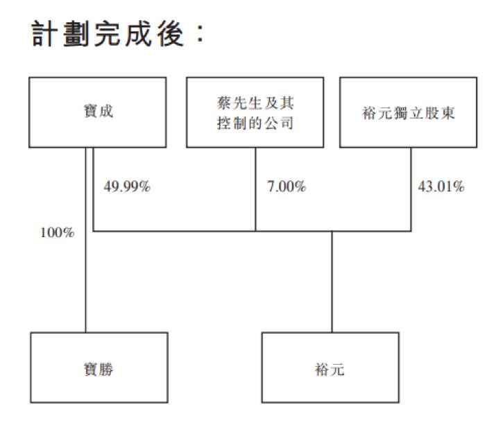 2008年,裕元集團將寶勝國際在港股分拆上市。十年后的2018年1月21日,寶勝國際公告稱,寶成工業提出每股2.03港元私有化上市公司,即將大股東裕元集團和其余股東手中全部股份收購注銷,將耗資109億港元。前一交易日收盤價為1.54港元,溢價31.82%。下圖為假設私有化完成后的持股情況: