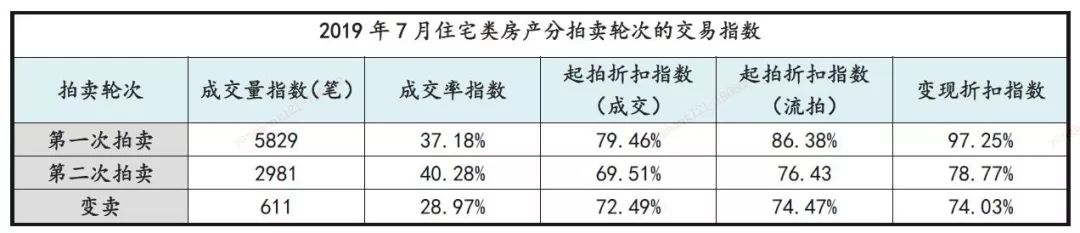 • 趨勢分析:7月住宅類房產拍賣市場成交量小幅降低,成交量9421筆,環比下降2.9%;成交率本期變化不大,為37.63%,較6月微升;起拍折扣指數為75.86%,較上月增長3%,變現折扣指數為89.89%,基本與6月持平。