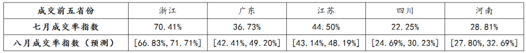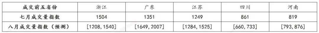 • 趨勢分析:7月在成交量上浙江省穩步增長,超越廣東省,排名第一;廣東省成交量出現大幅下降,環比下降17%;四川省與河南省的成交量都有所增加,四川省增幅較大,超越河南省,躍居第四,市場預期較好。從成交量走勢來看,浙江省與廣東省波動較為頻繁,特別是廣東省,每月的成交量變化較快。