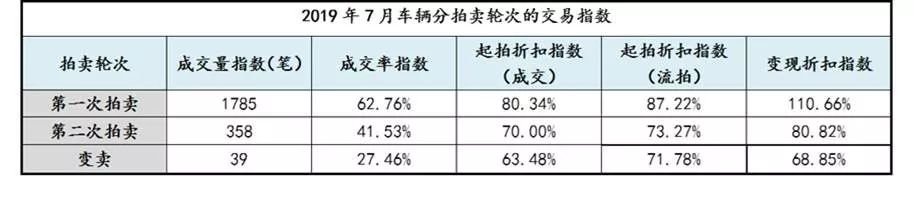 • 趨勢分析:7月車輛成交量為2182筆,小幅增長,增速較6月放緩,預測8月有回落趨勢;成交率為58.65%,較6月下降一個百分點;起拍折扣指數為78.34%,基本與上月持平;變現折扣指數為105.02%,小幅增長。