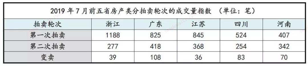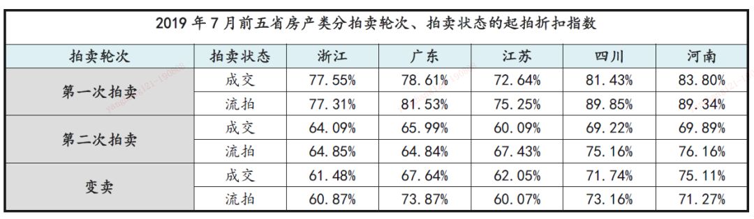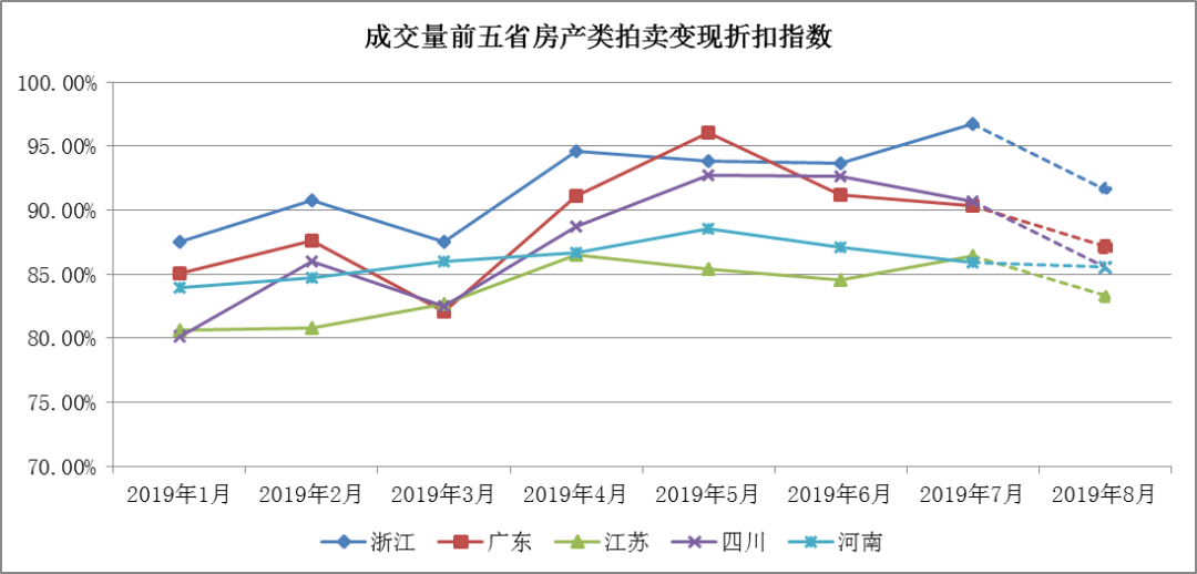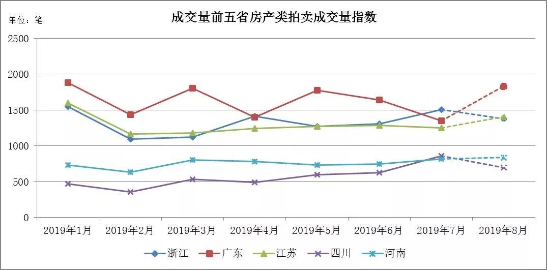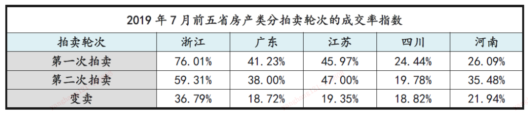 • 趨勢分析:7月的五省成交率變化有所差異,浙江省微升兩個百分點,江蘇省與河南省小幅增加4%,廣東省與四川省的成交率明顯下降。廣東省成交量與成交率雙降,說明市場處于低迷狀態,交易難度提升;四川省的成交量增加但成交率仍在下降,說明市場四川省的資產量多投資人相對較少,呈現明顯的買方市場。