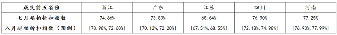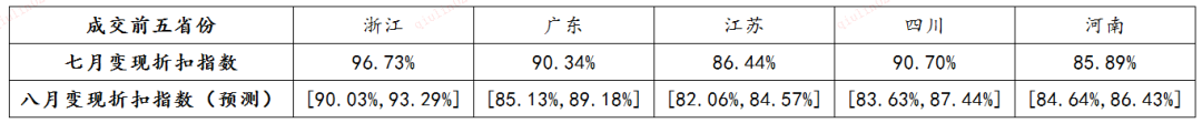 • 趨勢分析:7月浙江省、江蘇省變現折扣指數增幅較大,另三省呈下降趨勢。其中,浙江省的增幅最大,較6月增長3%,江蘇省在連續兩個月的下降后,7月變現折扣指數有所提升。整體來看,未來五省的變現折扣指數預期呈下降趨勢。