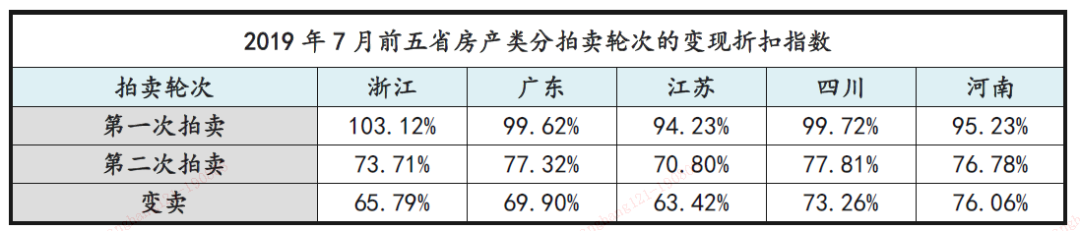 7月房產類拍賣品成交量前五省從高到低依次為浙江、廣東、江蘇、四川、河南。本月廣東省成交量、成交率下降明顯,市場活躍程度與流動性都在降低;前五省的起拍折扣指數波動較小,變現折扣指數整體呈現下降的預期趨勢,反映前五省房產類資產的市場投資認可度仍在降低。