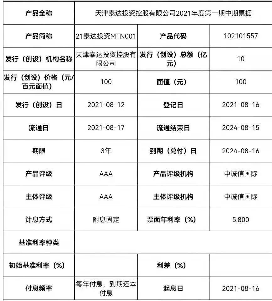 2021年8月16日,天津泰達投資控股有限公司(以下簡稱“泰達控股”)發行的“21泰達控股MTN001”正式起息。泰達控股本期中期票據的發行規模10億元,債券期限3年,票面利率為5.80%。這是6月份天津召開債券市場投資人懇談會之后,泰達控股首次成功發行長期限信用債券!!!更關鍵的是,本期中期票據的發行利率大幅下降,標志著投資者對于泰達控股的充分認可,意味著泰達控股在信用債券市場上王者歸來!