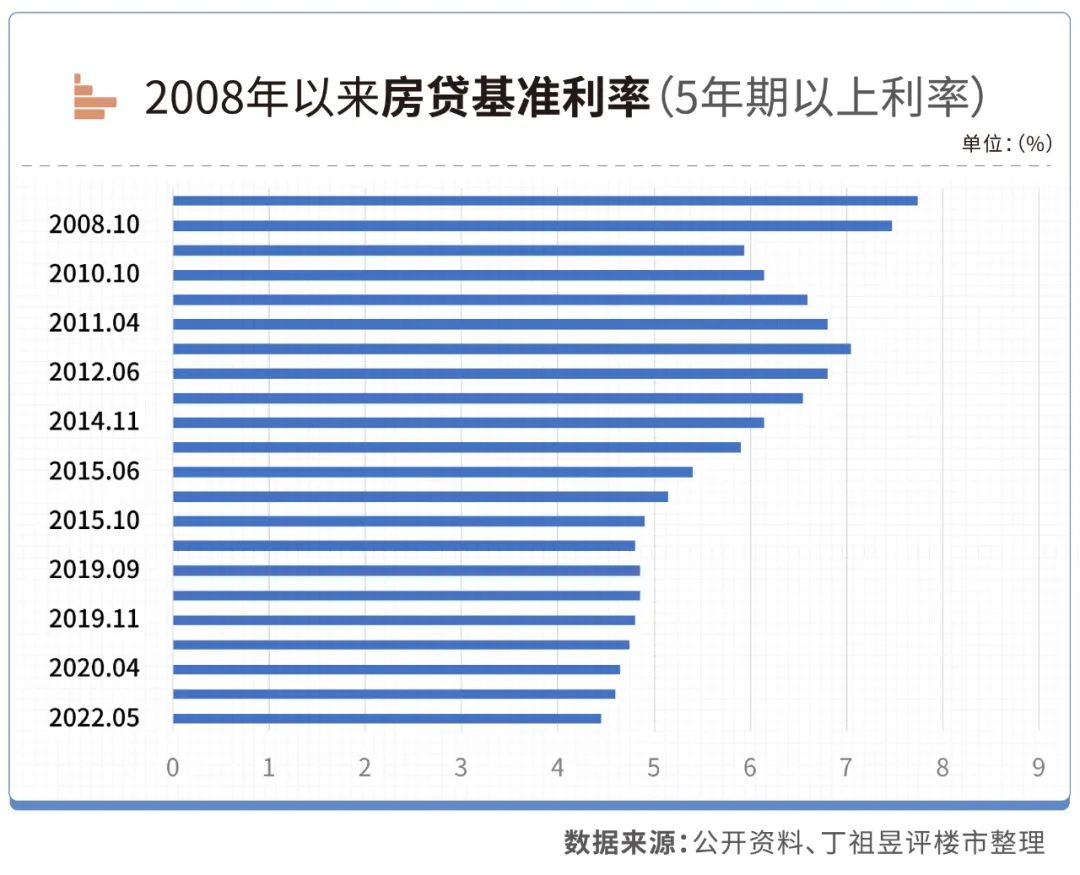 為了刺激購房需求,據CRIC梳理,僅2008年全年就有5次降息,累計降幅2.16%,當年12月5年期以上貸款利率下降至5.94%。