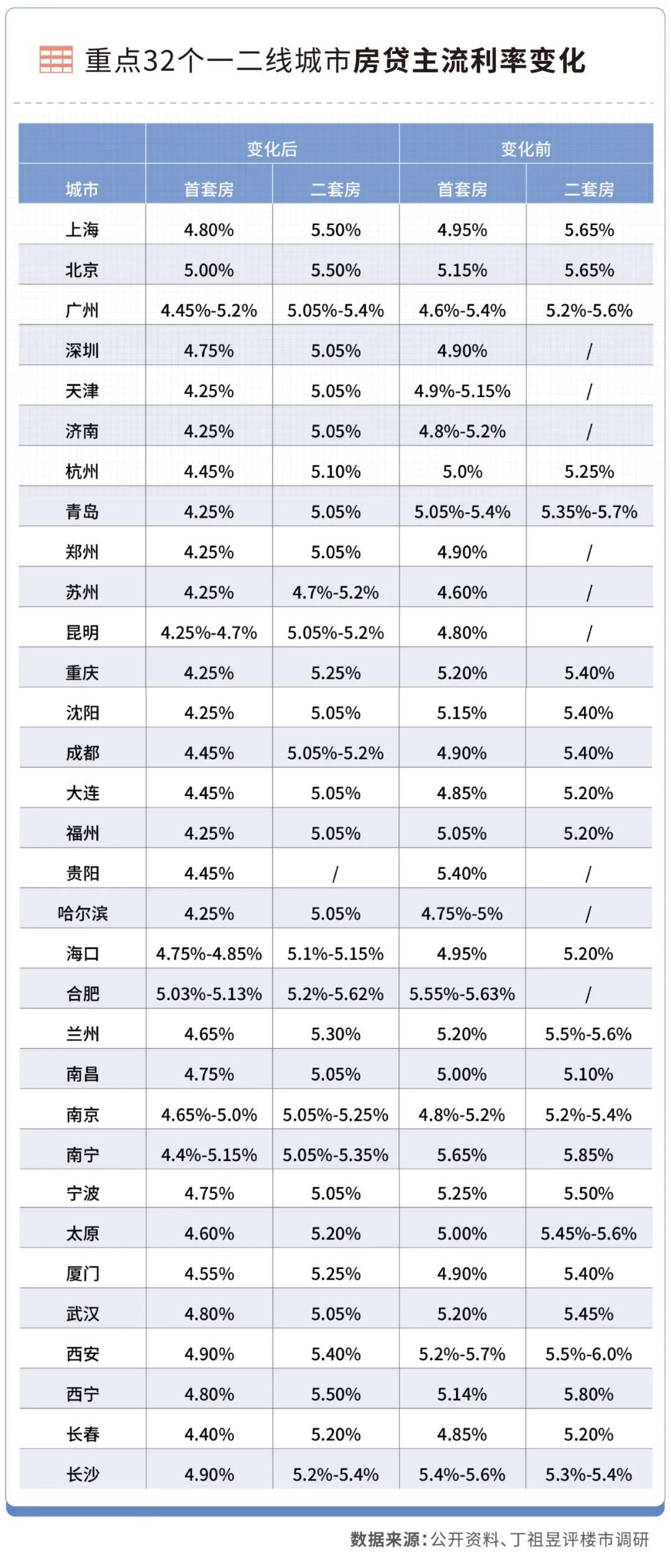 據丁祖昱評樓市不完全統計,截至5月28日32個一二線城市中,有11個二線城市最低可執行首套4.25%的房貸利率,18個城市執行二套5.05%的房貸利率。