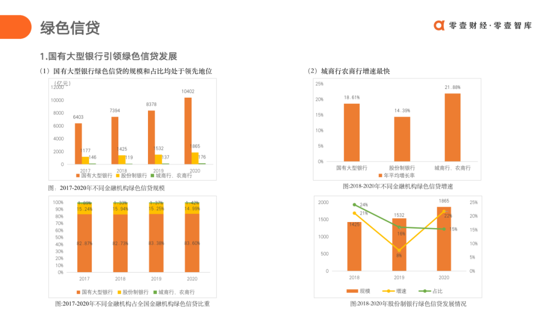 綠色信貸是中國綠色金融發展的主力軍。2020年,中國綠色信貸余額實現線性增長。其中,國有大型銀行引領綠色信貸發展,城商行、農商行綠色信貸增速度最快;北京綠色信貸余額最大,河南增速最快;東部地區綠色信貸余額增速穩居第一,中西部占比增大。