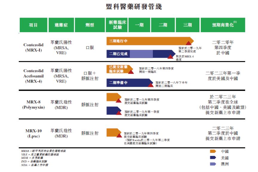 盟科醫(yī)藥是以研發(fā)多重耐藥即超級(jí)細(xì)菌感染的抗菌藥為主。公司的在研項(xiàng)目只有4個(gè),其中主要產(chǎn)品有治療革蘭氏陽(yáng)性多重耐藥菌感染的contezolid(MRX-I)以及contezolid acefosail(MRX-4)。公司研發(fā)最快的項(xiàng)目MRX-I預(yù)計(jì)最快2020年年底在國(guó)內(nèi)上市。