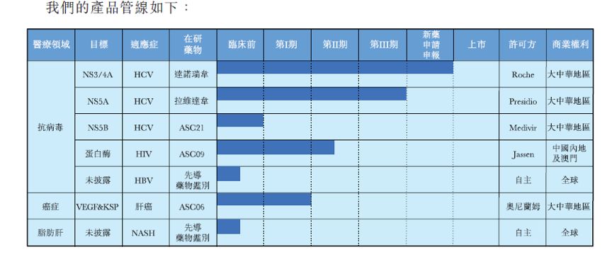 公司的核心產(chǎn)品包括戈諾衛(wèi)(達(dá)諾瑞韋)、拉維達(dá)韋、ASC09以及ASC06。目前中國(guó)食品藥品監(jiān)管總局于2018年6月8日授出有關(guān)戈諾衛(wèi)的新藥申請(qǐng)批準(zhǔn),并在國(guó)內(nèi)開(kāi)始將戈諾衛(wèi)進(jìn)行商業(yè)化。以下是公司7個(gè)在研藥品的研發(fā)進(jìn)度。