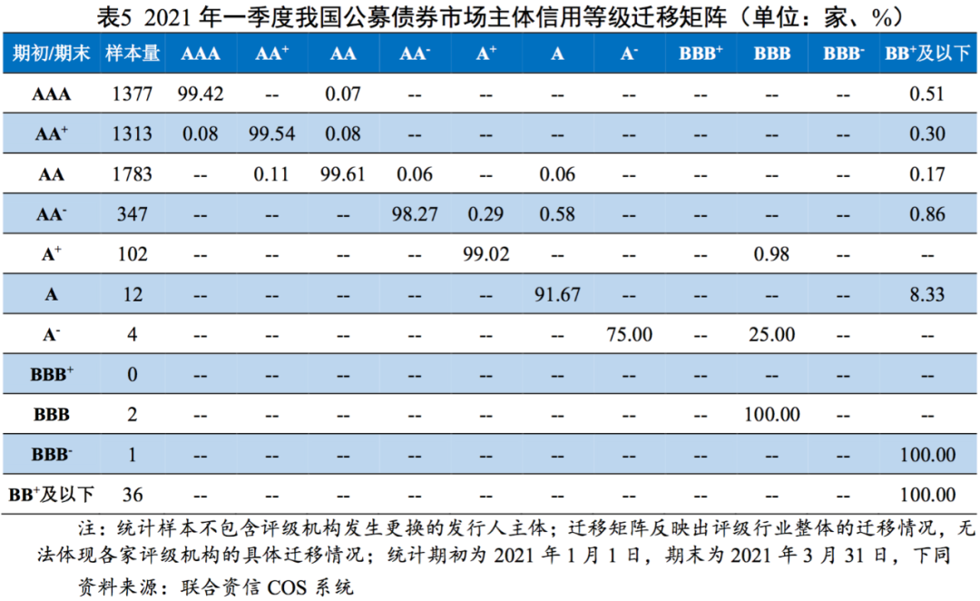 2021年一季度,我國公募債券市場多數(shù)發(fā)行人和債券尚未進(jìn)入評級跟蹤期,發(fā)行主體信用等級遷移數(shù)量相對較少,評級穩(wěn)定性整體較高。從信用等級遷移方向來看,樣本數(shù)量較多的A+級及以上級別均呈現(xiàn)向下遷移趨勢。
