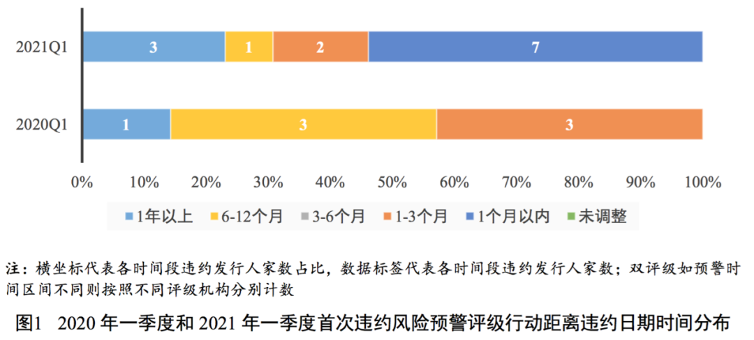 2021年一季度,我國債券市場13家新增違約發(fā)行人中有12家在違約前具有有效信用等級,違約事件發(fā)生前評級機構(gòu)均通過各類評級行動進(jìn)行了風(fēng)險預(yù)警[7],首次違約風(fēng)險預(yù)警評級行動日期距離違約日期時間在1個月以內(nèi)的有7家,1~3個月(含)的有2家,6~12個月(含)的有1家,1年以上的有3家。整體來看,2021年一季度信用評級的預(yù)警及時性較2020年一季度有所下降,主要系海航集團(tuán)流動性危機較早爆發(fā)且風(fēng)險處置工作復(fù)雜,部分海航系發(fā)行人因技術(shù)性因素(無法提供跟蹤評級所需資料等)導(dǎo)致評級預(yù)警動作滯后。
