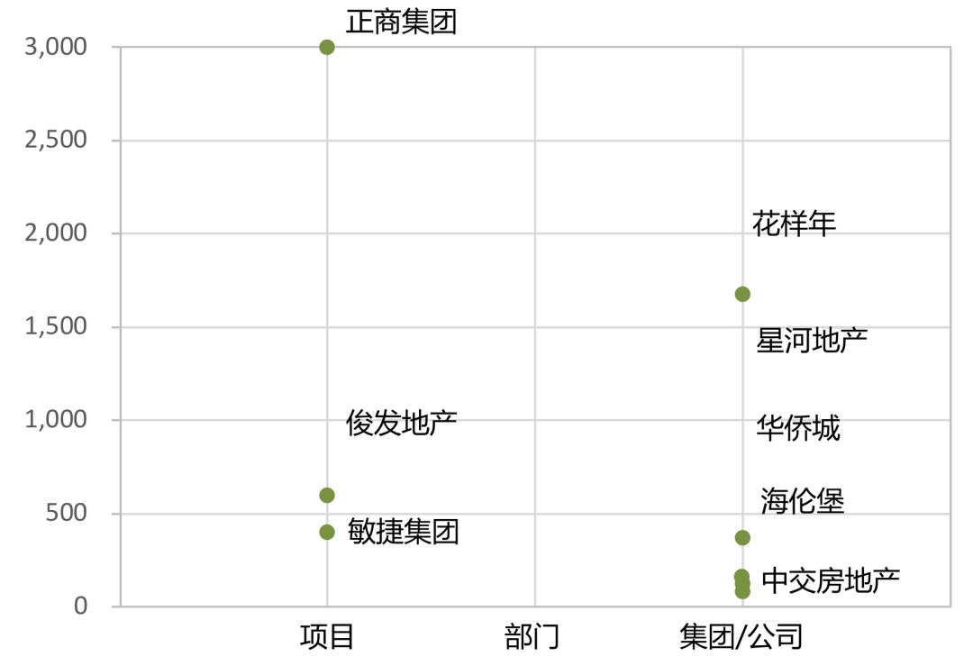 與TOP50房企不同,城市更新業(yè)務因對主體資本及渠道要求較高,僅11家TOP51-100房企積極布局城市更新業(yè)務板塊,城市更新項目建面主要集中在1000萬平方米以內。
