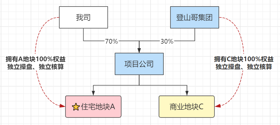 模式2:分地塊分帳套獨立核算。即收購部分股權,但雙方約定“該部分股權”對應“目標地塊100%開發收益權”,和原股東之間采用“分帳套方式獨立核算、獨立投入、操盤,獨立享有收益、承擔風險”。