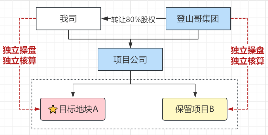 即收購目標公司80%的股權,對應二期地塊的開發權益,雙方分賬套獨立核算。目標公司其余資產權益仍歸登山哥公司所有,目標地塊與保留地塊的成本、稅費、收益、債權債務按照各自區域獨立核算并分別成立專屬資金賬戶負責專屬記賬及獨立收、支。
