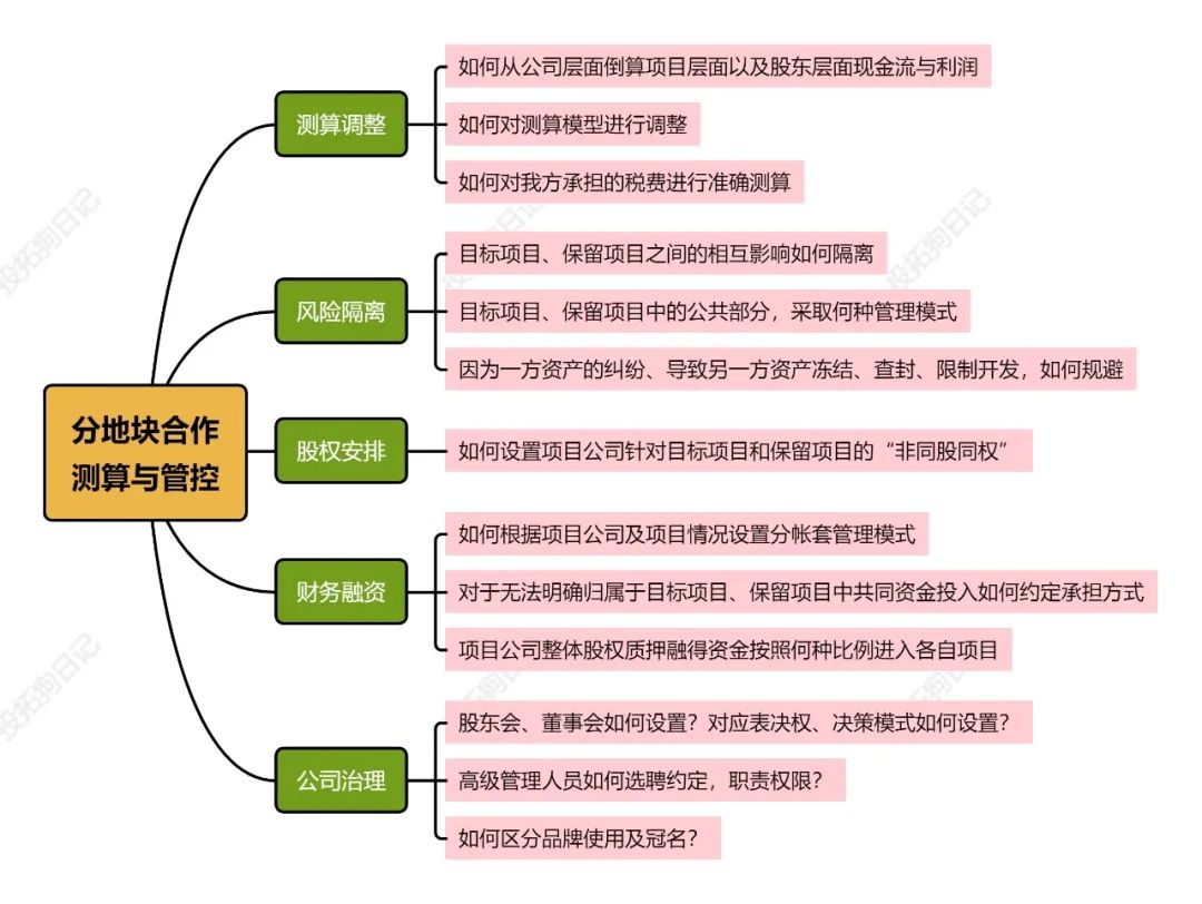 2、分地塊獨立核算的模式:前期可避免交易稅費的繳納且流程簡單,僅需要完成一步股轉即可,但是對于協議及風控上更加嚴格,后期操盤中相互扯皮的事會比較多。
