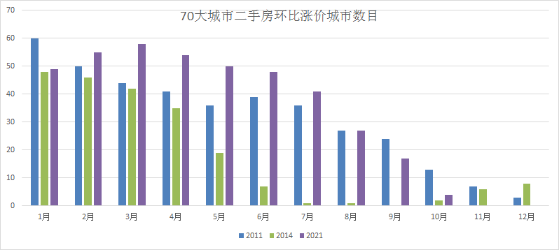其次,此輪地產降溫前,房地產需求端數據好于前兩輪(2011、2014)。從圖中可以看到,在降溫前,當前房價上漲城市數目是明顯高于2011和2014年的。