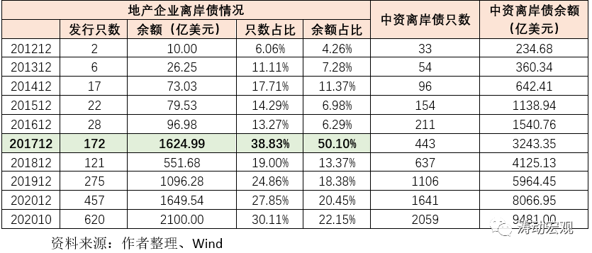 2、自2012年11月15日國資背景的中國海外發(fā)展在香港發(fā)行第一只離岸地產(chǎn)債以來,不到十年的時間里,中資離岸地產(chǎn)債數(shù)量已驟升至目前的620只,規(guī)模亦達(dá)到2100億美元(約合人民幣1.40萬億元),占全部中資離岸債規(guī)模的22%以上,成為僅次于金融債的第二大中資離岸債品種。