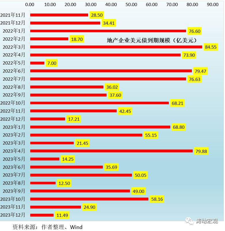 2023年全年將有138只地產(chǎn)企業(yè)美元債到期,到期規(guī)模合計達(dá)到480億美元左右。其中,一至四季度分別到期145億美元、130億美元、112億美元和95億美元,到期數(shù)量分別達(dá)到38只、38只、33只和29只。