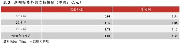 新鄭投資,每年獲得政府在資本注入和政府補助方面的支持,其中,政府補助在凈利潤的占比均超過50%。
