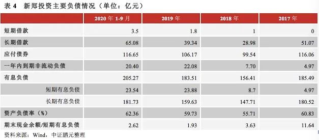新鄭投資的外部融資,以債券為主,銀行借款為輔。第一,2017年來債券融資在有息負債中的占比超過50%,2017年為63%,2020年三季度末為57%。截至2021年3月末,公司債券的發行方式均為私募。第二,有息負債中,以長期債務為主,占比在80%以上,2019年來隨著債務到期,短期有息占比從2017年的3%上升至2020年三季度末的11%。第三,公司資產負債率2018年維持上升趨勢,期末現金對短期有息負債的覆蓋倍數近年有所下滑,但仍位于較高水平。