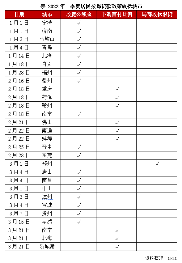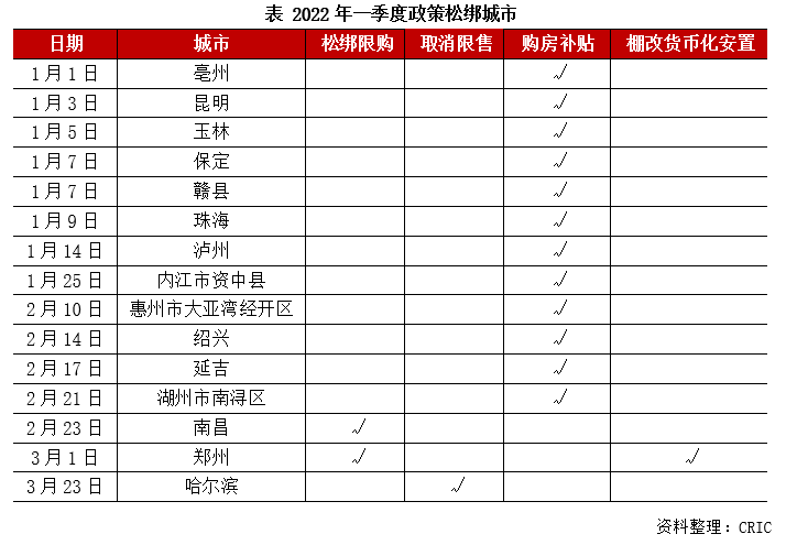 2022年一季度,中央多部委密集表態穩地產,財政部明確今年內不具備擴大房地產稅改革試點城市的條件,兩會定調探索行業新發展模式,支持新市民等三類購房需求。房企融資、預售資金監管適度松綁,并購貸不計入“三道紅線”、保障性租賃住房貸款不計入“兩道紅線”、全國性商品房預售資金監督管理辦法出臺。居民按揭貸款政策邊際改善,各地放寬公積金貸款、下調首付比例、局部放松限貸、下調房貸利率。15城出臺新政刺激購房需求,重點涉及松綁限購、取消限售、發布購房補貼、棚改貨幣化安置等。