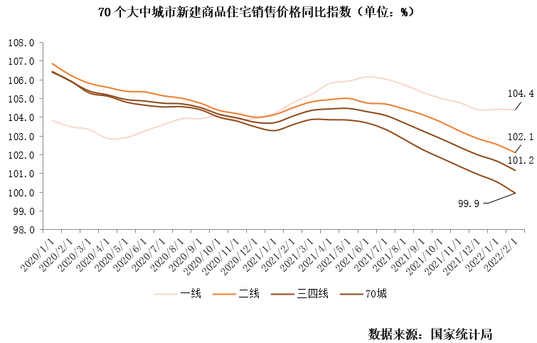 1-2月商品房銷售均價為9845元/平方米,環比上升3%,同比下降11%。2月70個大中城市新建商品住宅銷售價格同比上升1.2%,其中三四線城市同比下降0.1%。