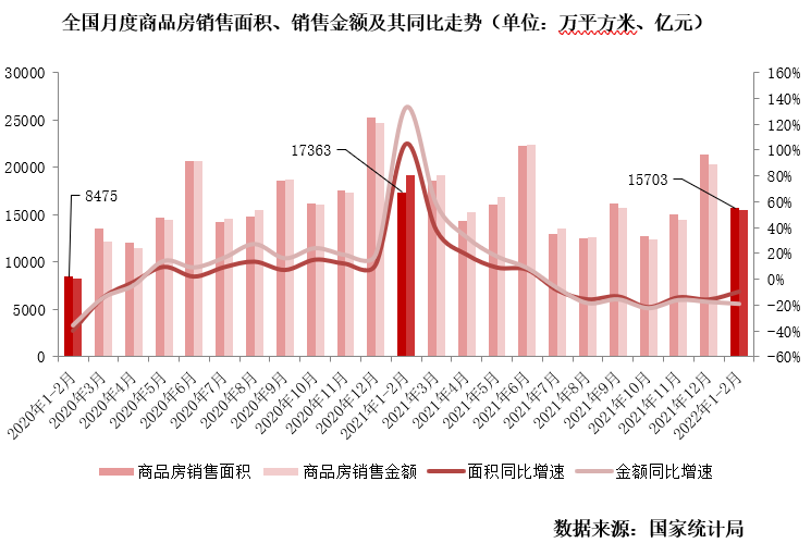 據國家統計局數據:1—2月,商品房銷售面積15703萬平方米,同比下降9.6%;商品房銷售額15459億元,下降19.3%。