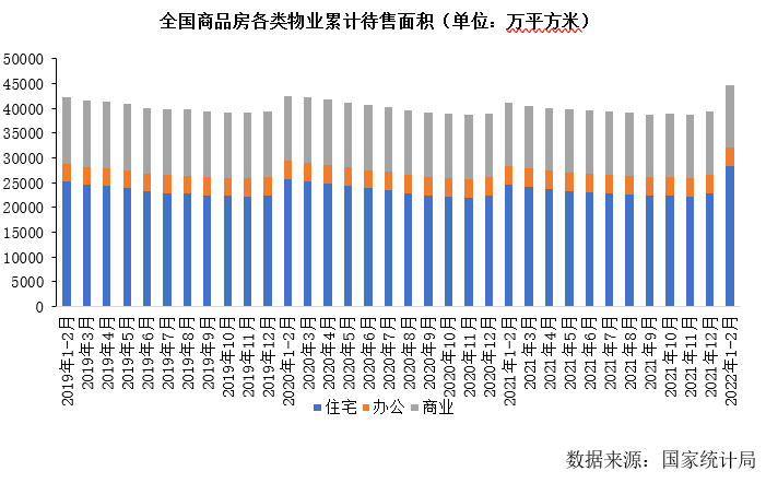 國家統計局公布數據顯示,2月末,商品房待售面積57026萬平方米,比2021年末增加6003萬平方米。其中,住宅待售面積增加5552萬平方米,辦公樓待售面積增加104萬平方米,商業營業用房待售面積減少335萬平方米。
