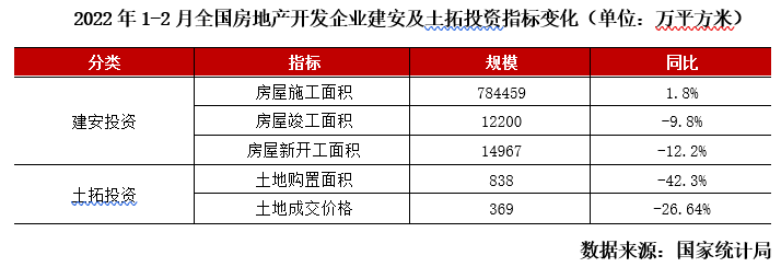 2022年一季度行業繼續調整,前2月銷售和投資同比增速均為近6年次低,全國商品房銷售面積、金額分別同比下降10%和19%,銷售均價同比下降11%。土地購置面積和房屋新開工、竣工面積分別同比下降42%、12%和10%,僅房屋施工面積微增2%,受此影響下開發投資額僅同比微增4%。