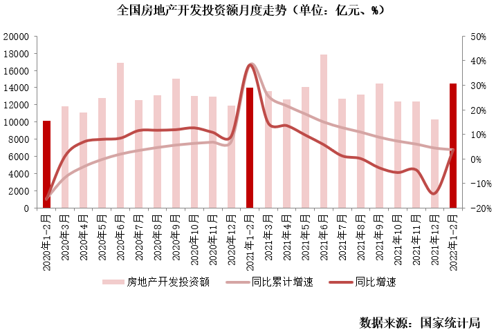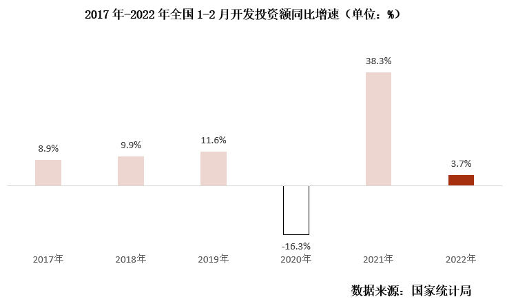 據國家統計局數據:1—2月,全國房地產開發投資14499億元,同比增長3.7%。對比往年同期來看為近6年次低,僅高于2020年。