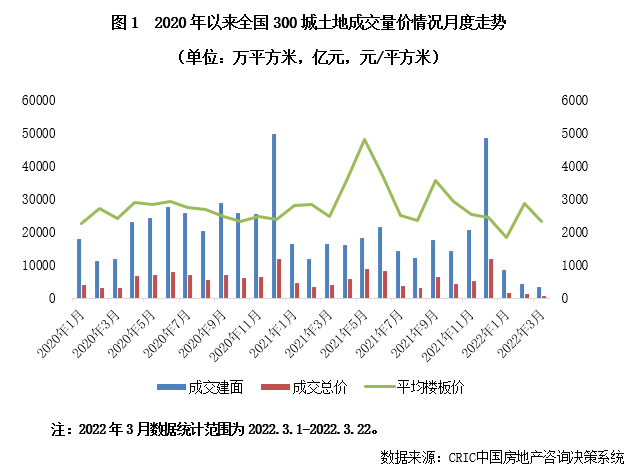 成交規模跌入谷底,同比降幅高達六成。一季度,全國300城經營性土地成交建筑面積僅15771萬平方米,環比跌幅高達81%,同比來看,受集中供地階段性“低谷”和市場下行的影響,同比降幅高達60%。分月來看,在供地節奏變化及多地疫情反彈的影響下,1-3月的土地成交量均明顯不及去年同期,一季度土地成交規模也因此跌入谷底。