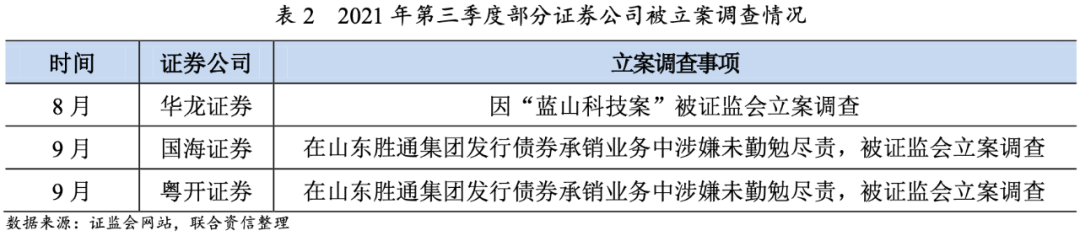 2021年第三季度,華龍證券、國海證券、粵開證券等證券公司因投行業(yè)務(wù)中未勤勉盡責(zé)等原因被證監(jiān)會(huì)立案調(diào)查,證券公司監(jiān)管處罰頻次較2季度有所減少,多家證券公司因營業(yè)部內(nèi)控等問題受到監(jiān)管措施。