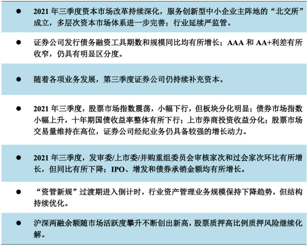 2021年三季度,國內(nèi)股票市場行情波動(dòng)加大,呈結(jié)構(gòu)性行情,但股票市場交易量維持在高位,兩融業(yè)務(wù)實(shí)現(xiàn)較好發(fā)展;投資銀行類項(xiàng)目過會(huì)率環(huán)比有所下降,IPO、增發(fā)和債券承銷金額同比均有所增長;資產(chǎn)管理業(yè)務(wù)結(jié)構(gòu)持續(xù)優(yōu)化,股票質(zhì)押業(yè)務(wù)風(fēng)險(xiǎn)逐步化解。