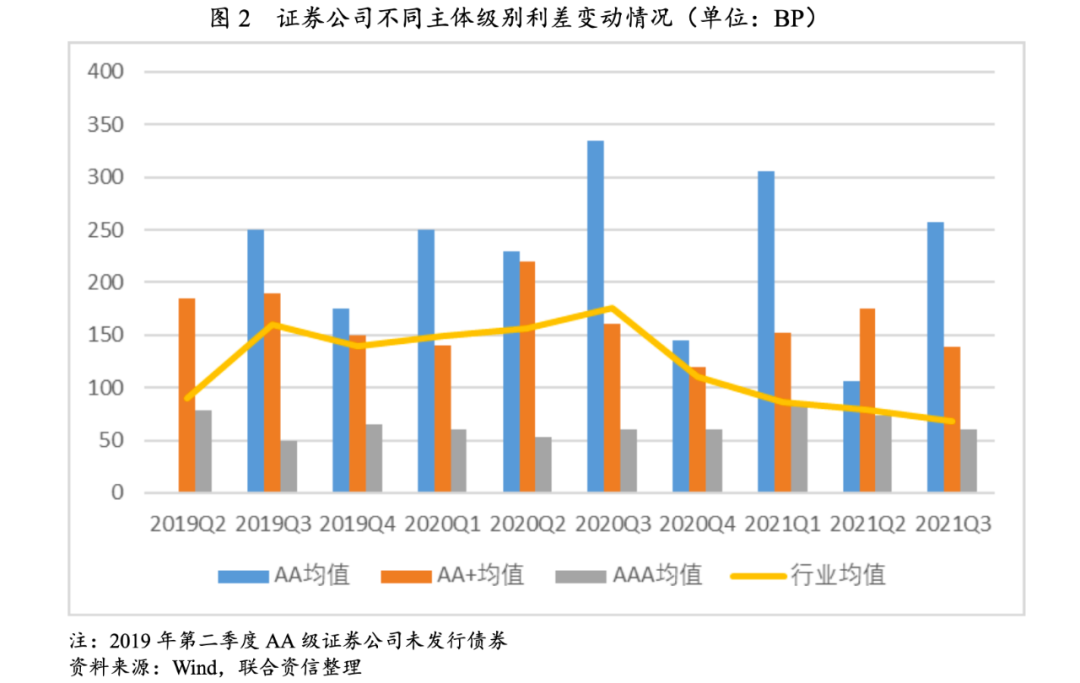 2021年第三季度,證券公司發(fā)行利差有所收窄,其中主體評(píng)級(jí)為AAA和AA+證券公司發(fā)行利差均值降幅較大,AA級(jí)證券公司利差均值有所上升;行業(yè)利差均值68.34BP,環(huán)比下降10.99BP;AAA證券公司平均利差低于AA+利差78.76BP,差額環(huán)比下降21.97BP。