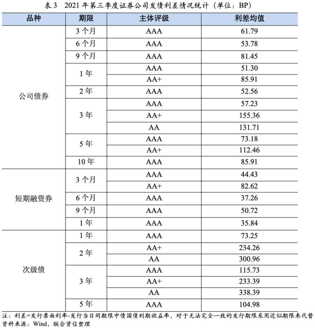 2021年第三季度,證券公司發(fā)行利差均值68.34BP,較二季度下降10.99個(gè)BP。證券公司發(fā)行不同債券品種在不同主體評(píng)級(jí)和不同期限上均具有明顯區(qū)分度,AAA主體發(fā)行利率顯著低于AA+級(jí)證券公司,AAA級(jí)證券公司發(fā)行1年期和3年期公司債券利差均值在50.30BP和57.23BP,遠(yuǎn)低于AA+證券公司發(fā)行同等期限公司債券利率,AA+與AA級(jí)券商發(fā)行3年期公司債券利差呈與評(píng)級(jí)等級(jí)倒掛狀態(tài),主要系A(chǔ)A級(jí)證券公司3年期公司債券具有擔(dān)保所致。AA+證券公司發(fā)行的5年期公司債券利差略低于同評(píng)級(jí)下的3年期公司債券,但考慮到三季度內(nèi)AA+證券公司僅發(fā)行了二期5年期限的公司債,該數(shù)據(jù)沒有可比性。AAA證券公司發(fā)行3個(gè)月期限短期融資券利差均值在44.43BP,AA+證券公司為82.62BP。AAA證券公司發(fā)行各年期次級(jí)債利差均低于AA+及AA級(jí)證券公司發(fā)行同期限的次級(jí)債券利差。綜上所述,AAA證券公司在融資成本方面優(yōu)勢明顯。